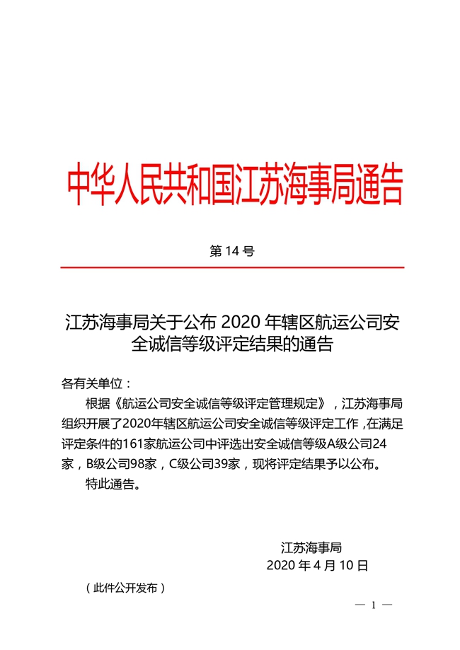 近日,在江蘇海事局組織開展的2020年轄區航運公司安全誠信等級評定工作中,中港建設集團有限公司在滿足評定條件的161家航運公司中脫穎而出,被授予“江蘇海事局安全誠信等級A級公司...